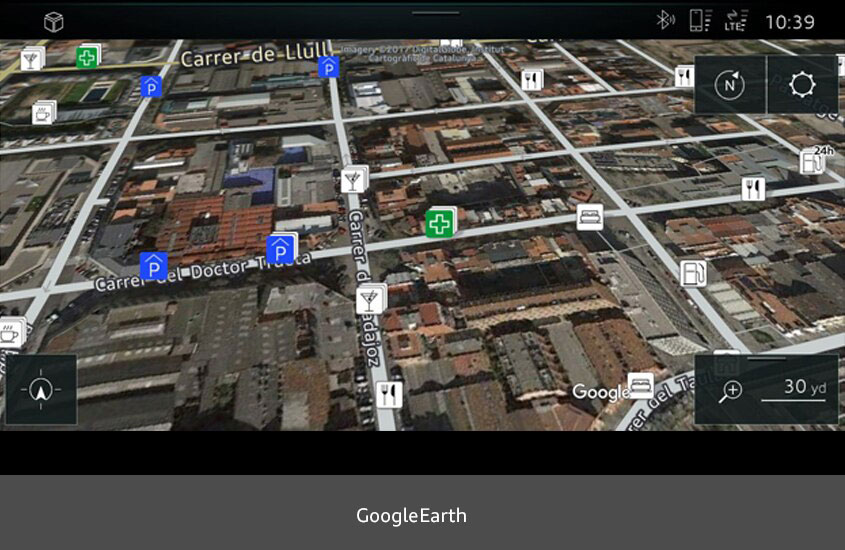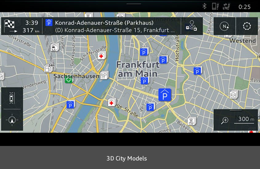 Keep track of the classic 2D navigation display or discover your environment via a 3D map view with city models or Google Earth satellite view, including information on terrain, street names and extended information on interesting places.