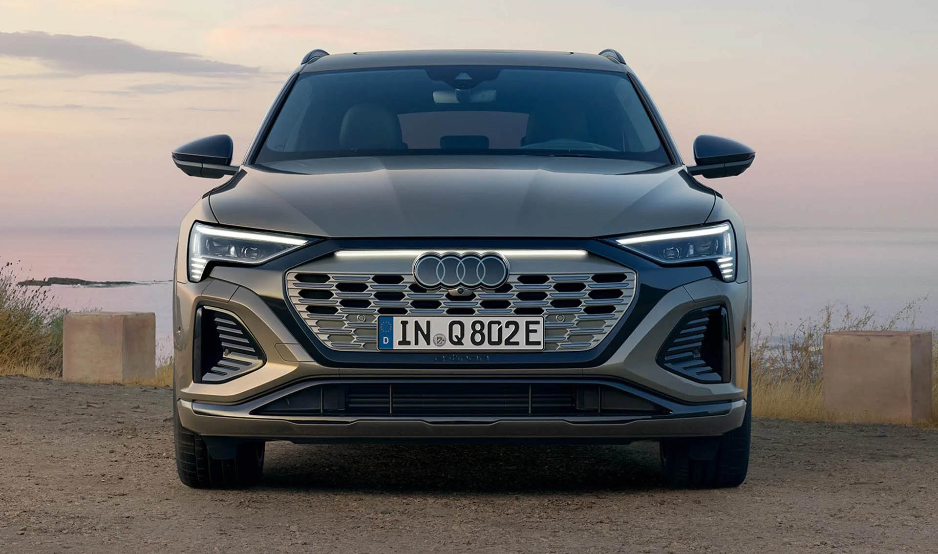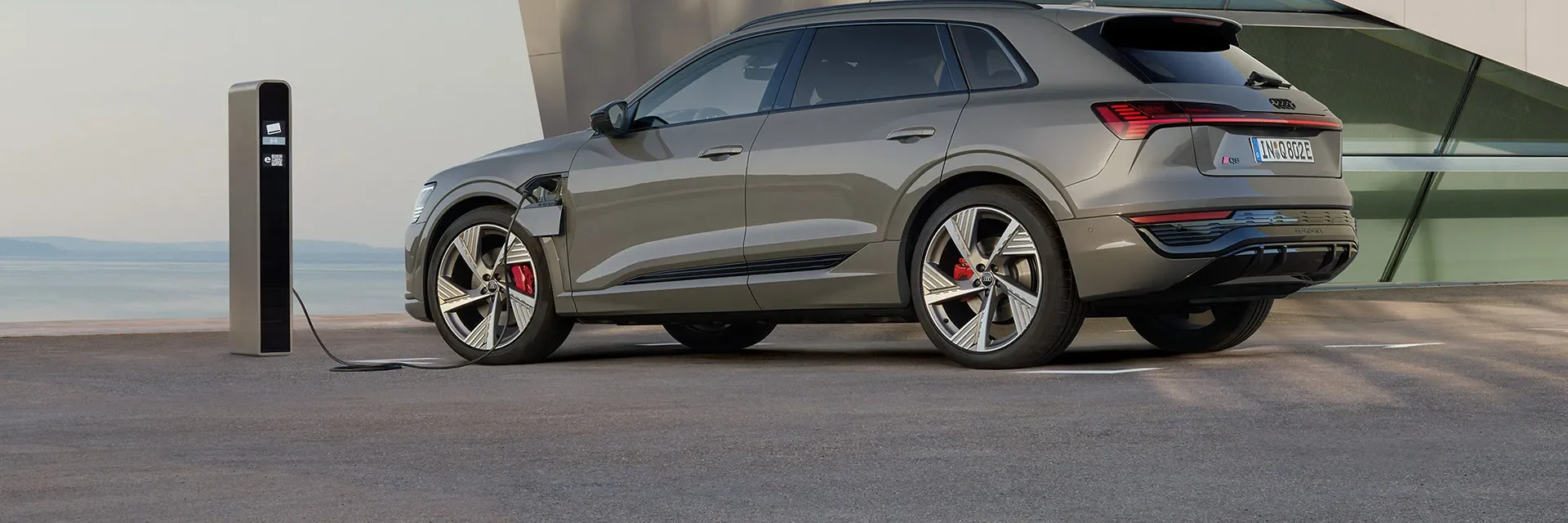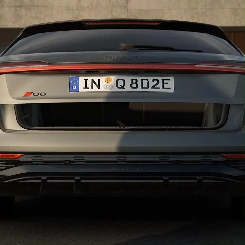The Audi Q8 e-tron sets an example for electromobility: with the progressive accents of the new Audi labelling strategy such as the Audi rings in 2D look, a revised front design and the optional Singleframe projection light.