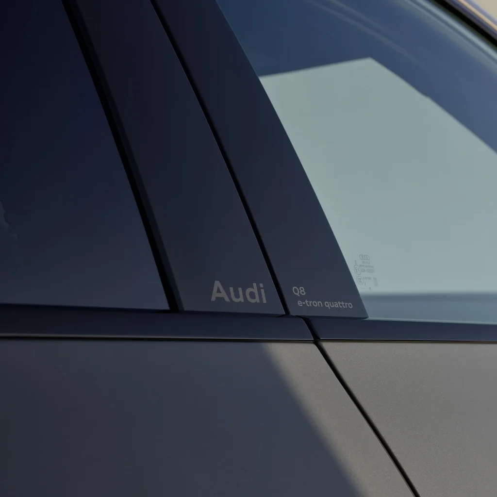 Details such as the laser-engraved model designation on the B-pillars, the Audi rings in a new look and the e-tron lettering express the constant further development of the design language.